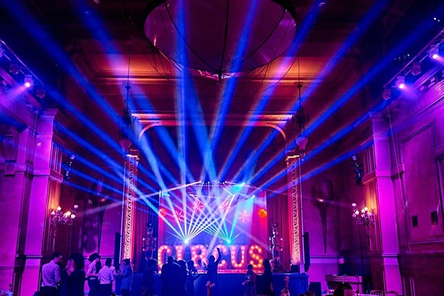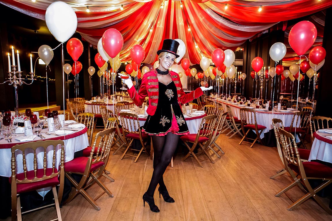 Imaginez une salle transformée en un chapiteau de cirque ensorcelant. Les murs drapés de tissus rayés, les lustres éclatants suspendus comme des étoiles, créent une ambiance magique. Les tables, dressées transportent les invités dans l’univers effervescent du cirque.